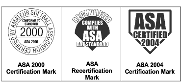 FIRST: ALL BATS MUST HAVE AN ASA STAMP to be eligible for use. NO STAMP - NO PLAY. Before purchasing a new bat please look for one of these ASA stamps: